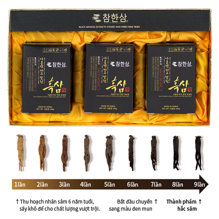 Cao hắc sâm Chamhansam là sản phẩm được bào chế từ hắc sâm Hàn Quốc 6 năm tuổi. Trải qua quá trình lựa chọn những củ Hắc sâm đủ 6 năm tuổi. Tiến hành làm sạch, ráo nước. Trước khi được đưa vào sấy hấp nhiều lần. Sau đó, được kiểm tra chất lượng củ sâm trước khi đưa vào công đoạn chế biến cô đặc thành cao dạng chất lỏng, dạng sệt hay bột.