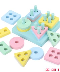 - Các khối gỗ đa dạng cả về hình dạng lẫn màu sắc giúp bé làm quen nhận biết hình khối và màu sắc
