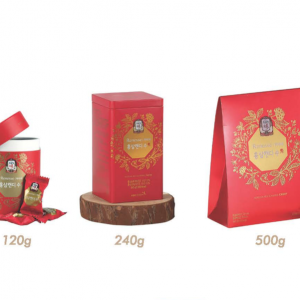 Riêng với sản phẩm kẹo hồng sâm KRG 500g sử dụng túi đựng bìa cứng. Thể hiện được toàn bộ nét hoa văn, họa tiết thương hiệu kẹo hồng sâm KGC tới từ tập đoàn nhân sâm nổi tiếng bậc nhất Hàn Quốc.